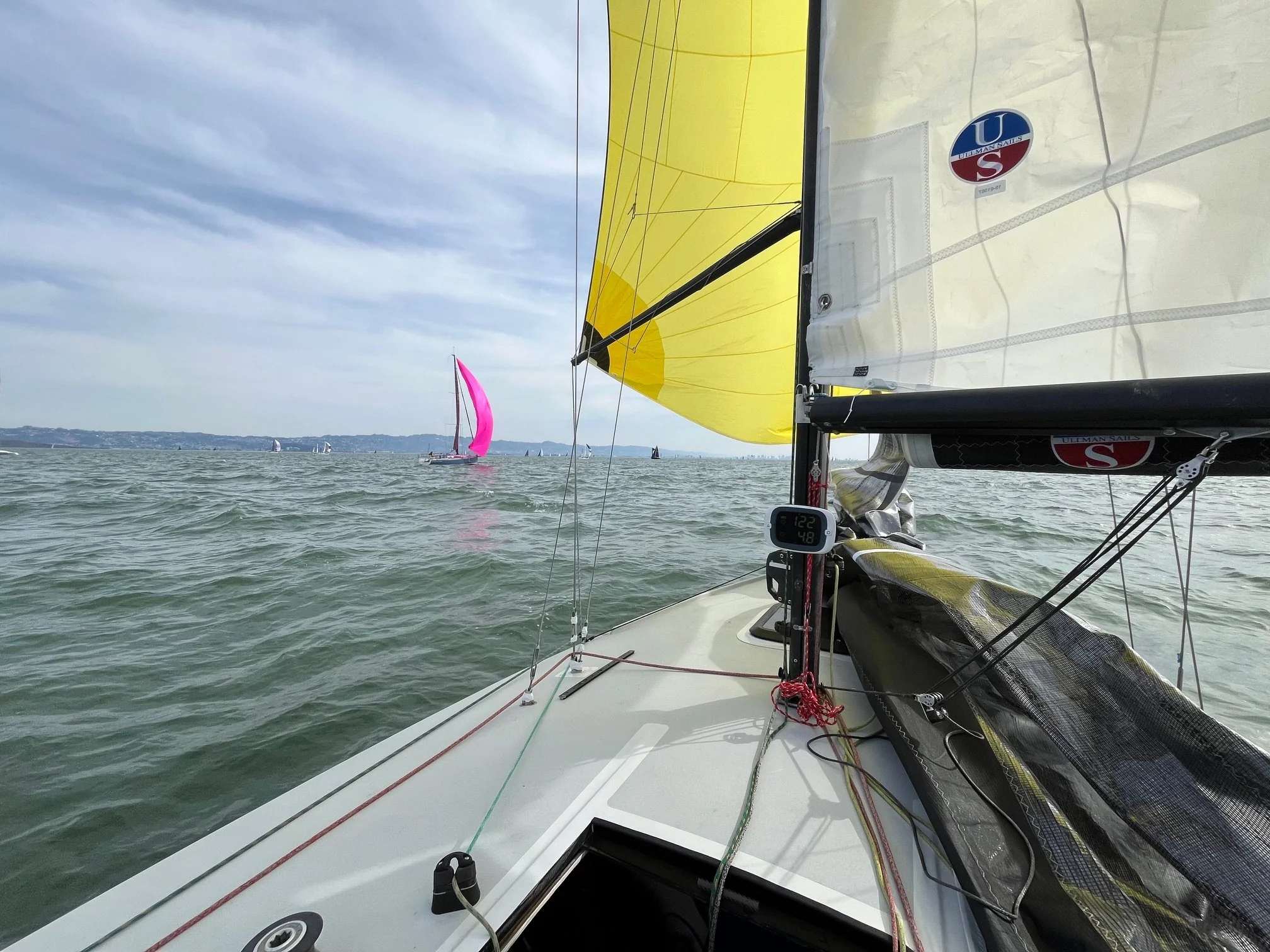 Being lake sailors at heart, the duo slightly misjudged the sheer muscle of the San Francisco flood and crossed the start line a few minutes late. Pleased to get over the line to start (another story for another day) the team immediately locked in on a route to Red Rock. They spent the day racing hard, learning how to make the Moore move in big water. The highlight was a spirited upwind session along the City Front, where they hitched a ride on a 4.5-knot ebb current that boosted their speed over ground to a staggering 9.5 knots in steep chop. Overpowered with the #1, Travis commented what a strange feeling it is to pinch and have the boat slow down upwind to 9 instead of 9.5 knots!